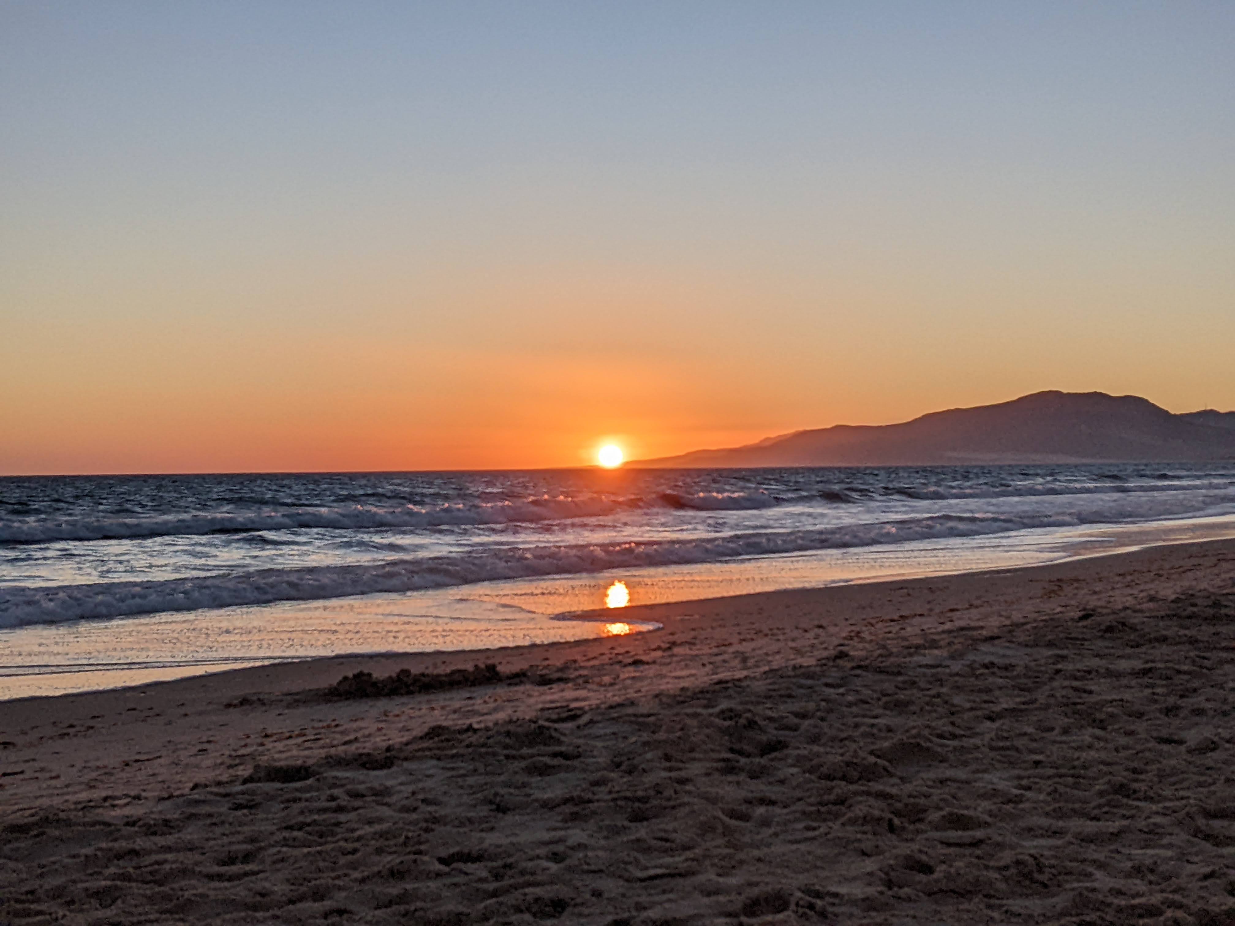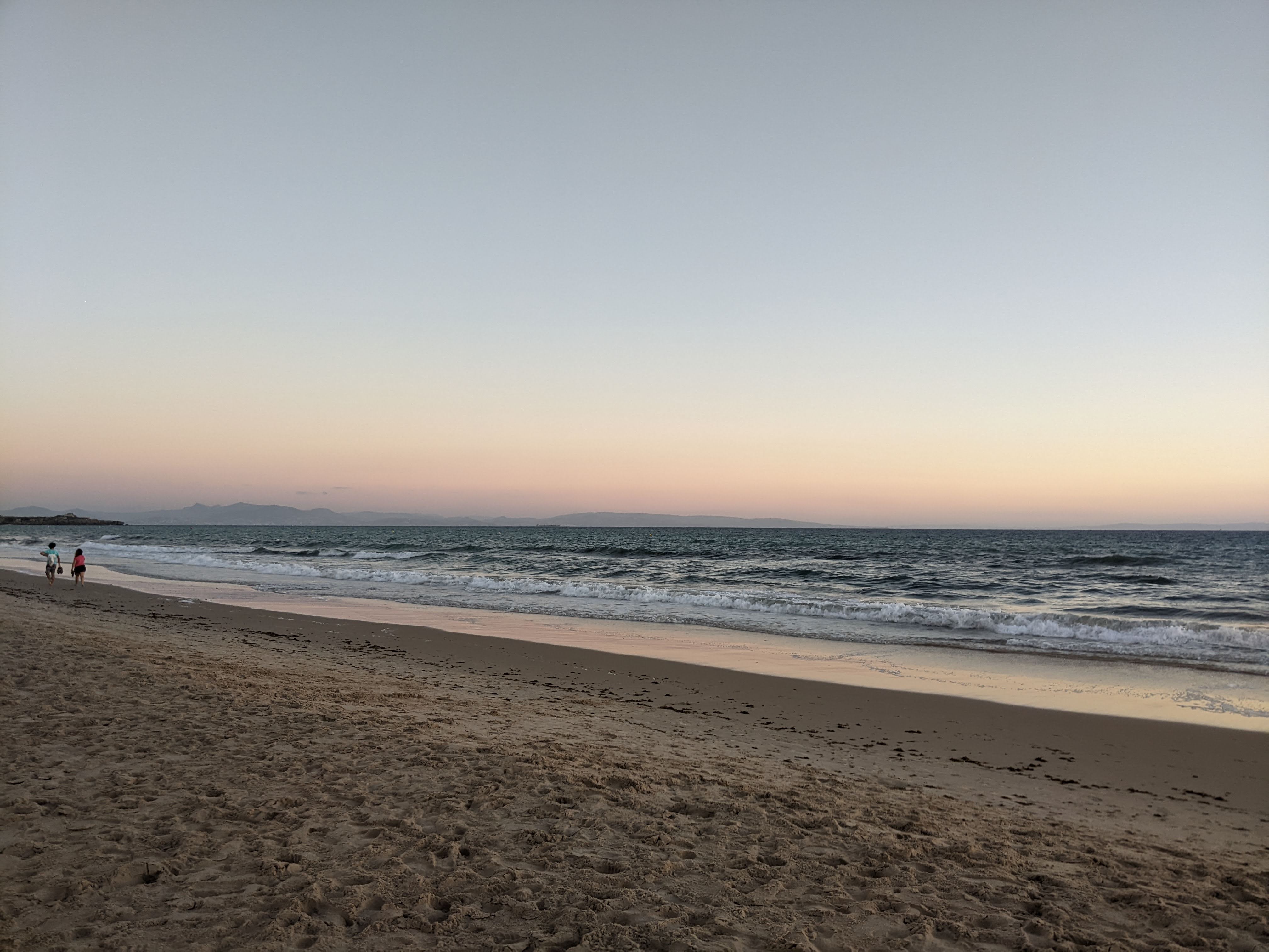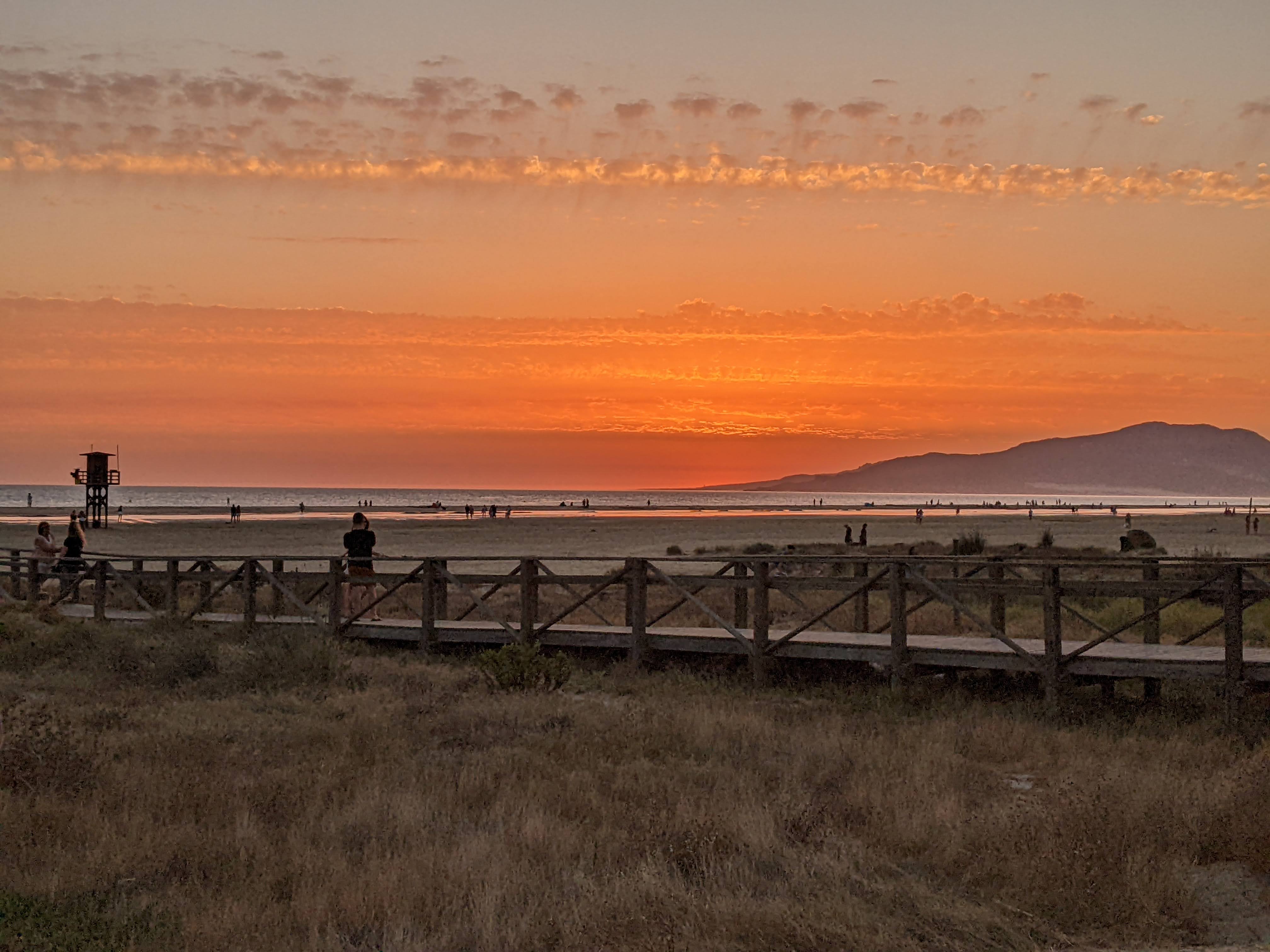 Voto 10+ va alle spiagge: enormi, infinite e … LIBERE!!!! Incredibile! Al mare, a pochi giorni dall’inizio di agosto e in pieno possesso del nostro spazio vitale, avendo addirittura la possibilità di fare un bagno o una passeggiata con i piedi nell’acqua senza dover schivare la gente. L’ho già detto? FANTASTICO! Inoltre, finalmente, in questo punto della Spagna, il tramonto che preferisco, con il sole che si tuffa in acqua e il cielo che lentamente si colora di rosso. Ovviamente a mettere la ciliegina sulla torta, noi, le seggioline e le nostre due immancabili birrette.