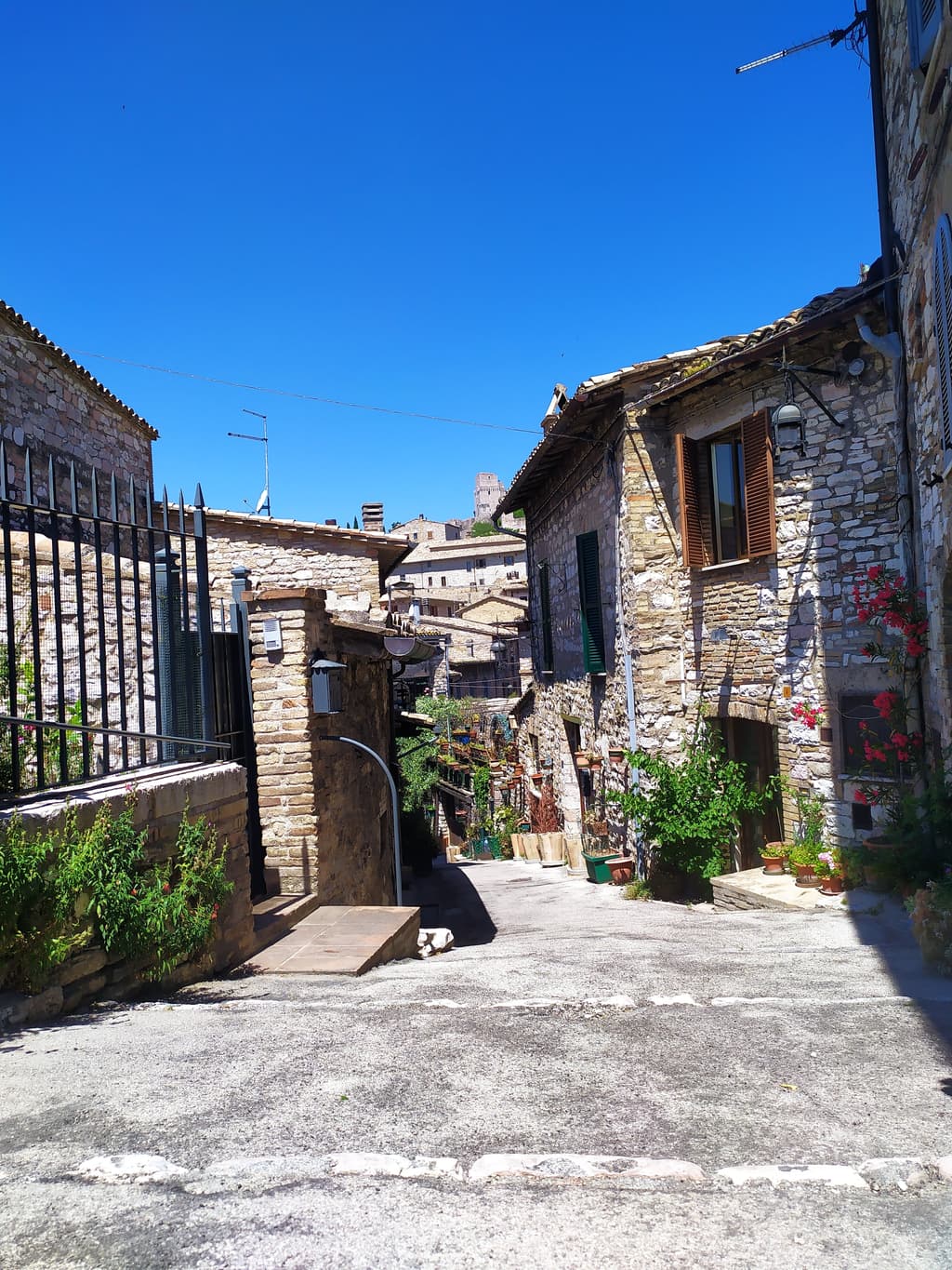 Beh è stata una goduria per i miei occhi: un piccolo borgo tutto costruito in pietra, con sali-scendi di viuzze, fiori e piante bellissimi, un panorama che neanche ve lo dico e, a rendere il tutto ancora più bello (grazie meteo!), un cielo, di un azzurro incredibile. Non sono una gran fotografa, anzi! Passo dopo passo, cercavo di immortalare immagini con il telefono e riproporre ciò che i miei occhi vedevano, ma questa cosa non succede praticamente mai… Sapete cosa mi piacerebbe tantissimo? Essere una Polaroid! Sbattere gli occhi, e far uscire, tipo dalla bocca, una foto che rispecchi e descriva fedelmente ciò che i miei occhi percepiscono: prospettive, distanze, colori, ombre, sfumature, particolari; sembra stupido, lo so, ma sarebbe estremamente divertente!
