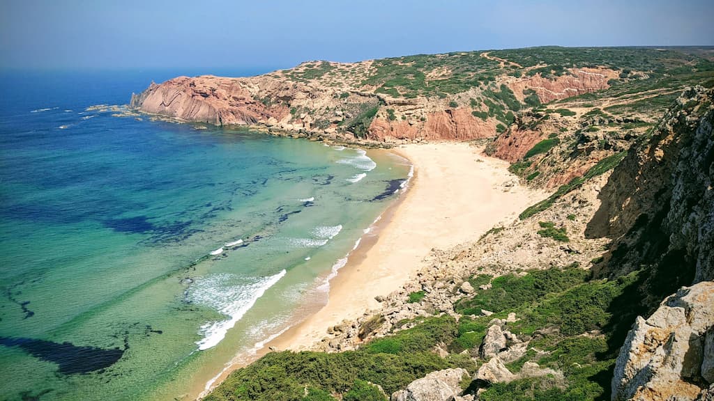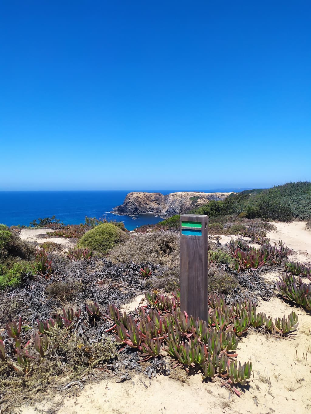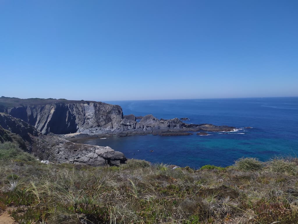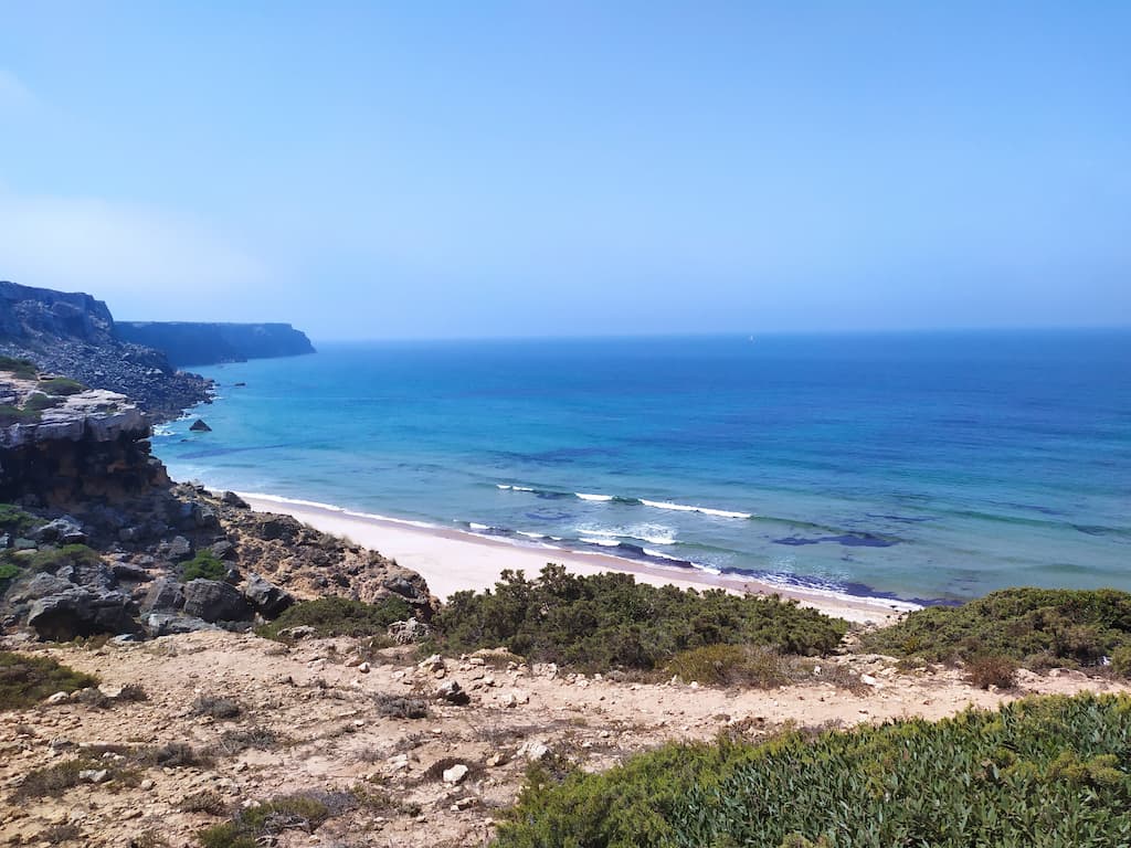 Ci addentriamo lungo la Rota Vicentina (contrassegnata da due strisce, una verde e una azzurra). Secondo l’app, la difficoltà del percorso è intermedia, ma a noi è sembrata abbastanza semplice, eccetto l’ultimo tratto e la discesa alla spiaggia.