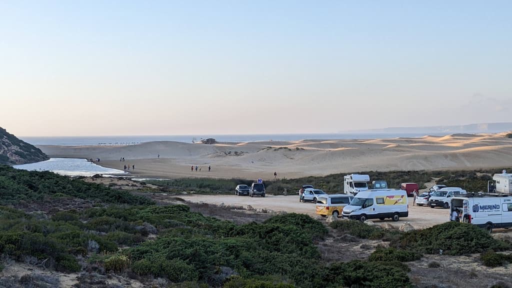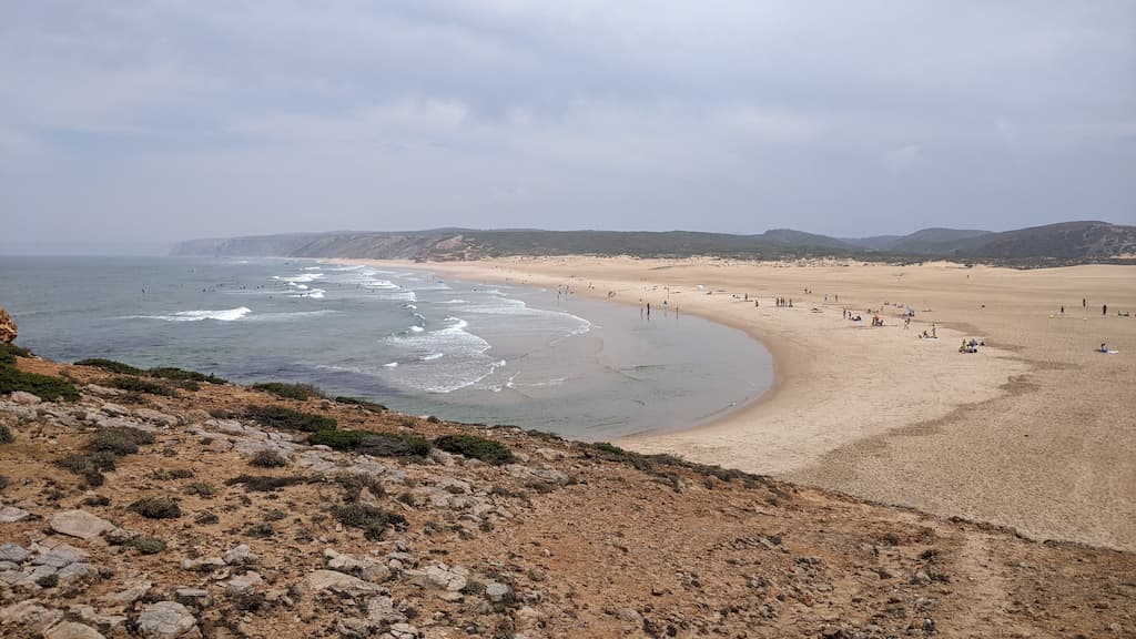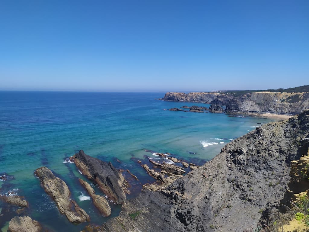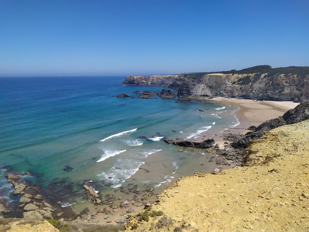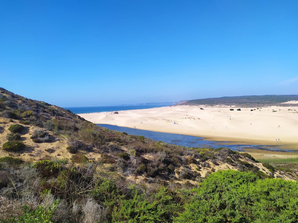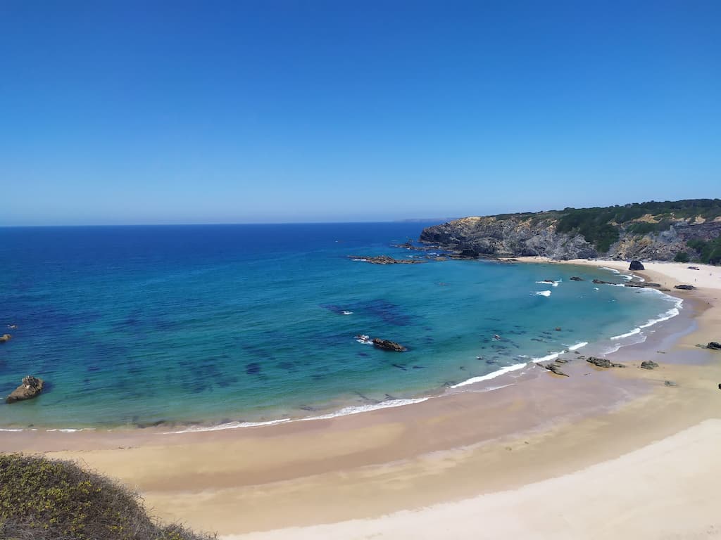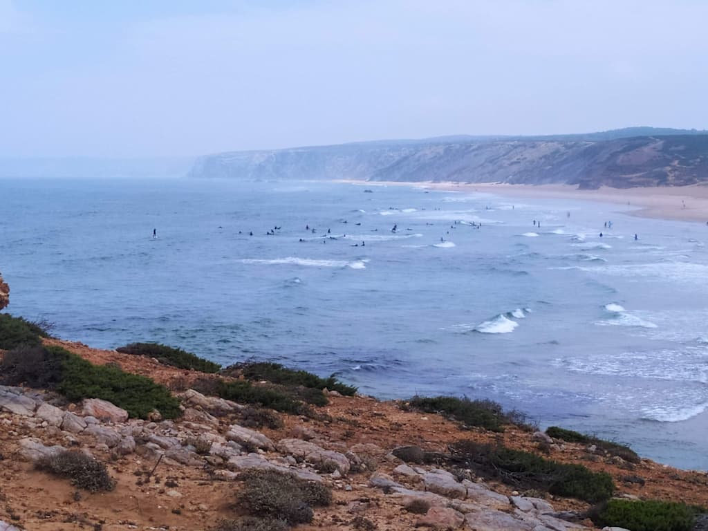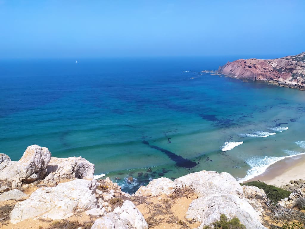 Soddisfatti della nostra giornata, ripercorriamo la strada fatta la mattina, torniamo verso Cabo de São Vicente, saliamo sul camper e ci dirigiamo verso Praia da Bordeira. Anche qui, uno spettacolo: dune di sabbia, spiaggia enorme, oceano e surfisti in acqua. Potrei risultare ripetitiva, ne sono consapevole, ma anche per questa tappa avevamo letto recensioni negative sui parcheggi e sulla possibilità di essere cacciati dalle forze dell’ordine, ma forse chi ha scritto i commenti negativi, ha dimenticato di specificare che magari aveva parcheggiato in modo poco consono alla situazione o forse un po’ pericoloso per lui e per la circolazione. Ribadisco, informarsi è giustissimo, ma va bene anche rischiare e vedere con i propri occhi. Abbiamo passato qui due notti in totale relax, ma sarebbe stato uno spreco non goderci un altro tratto di Rota Vicentina, quindi è di nuovo trekking. Lasciamo Bordeira e ci dirigiamo verso Azenha do Mar, punto di partenza del nostro percorso con destinazione Praia dos Machados. La camminata è stata più impegnativa rispetto alla precedente ma, caspita, che figata pazzesca! Trovarsi in mezzo a tutta quella meraviglia è disarmante, ci si sente così piccoli … siamo così piccoli …