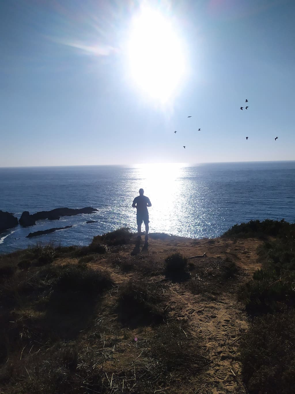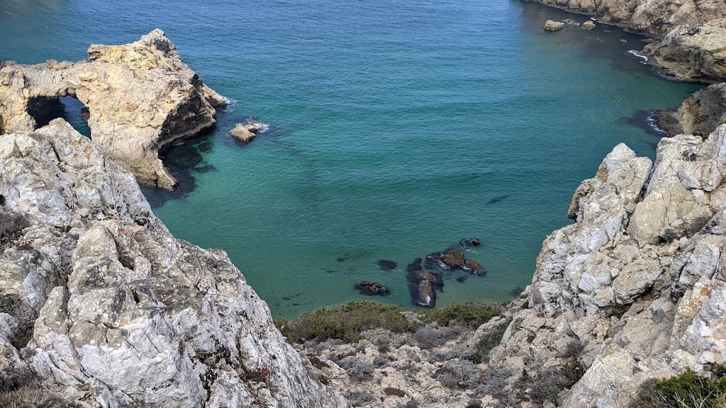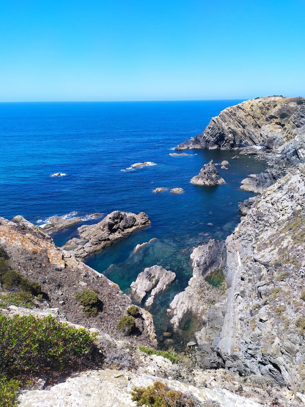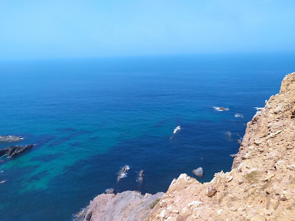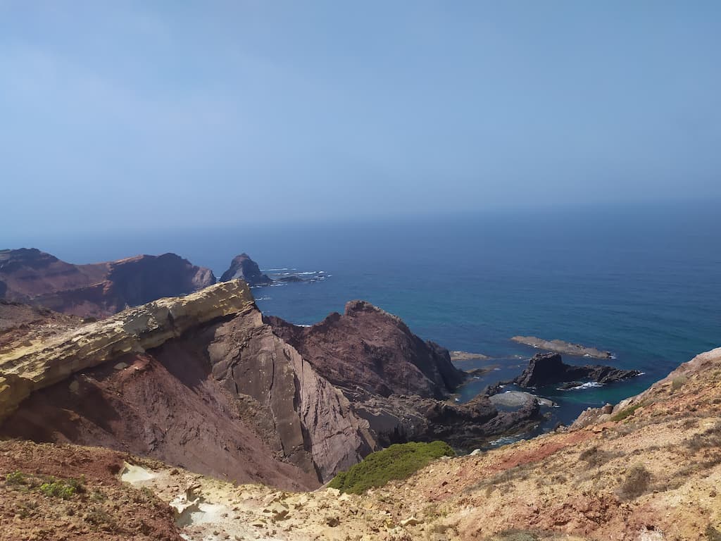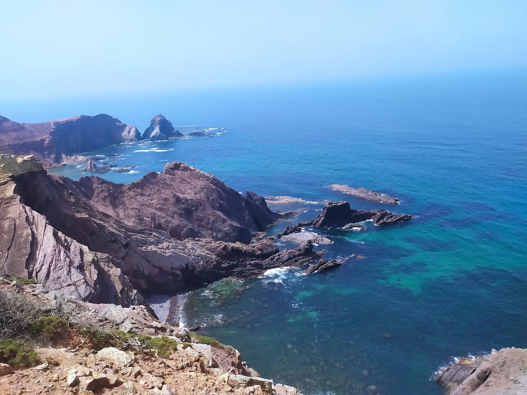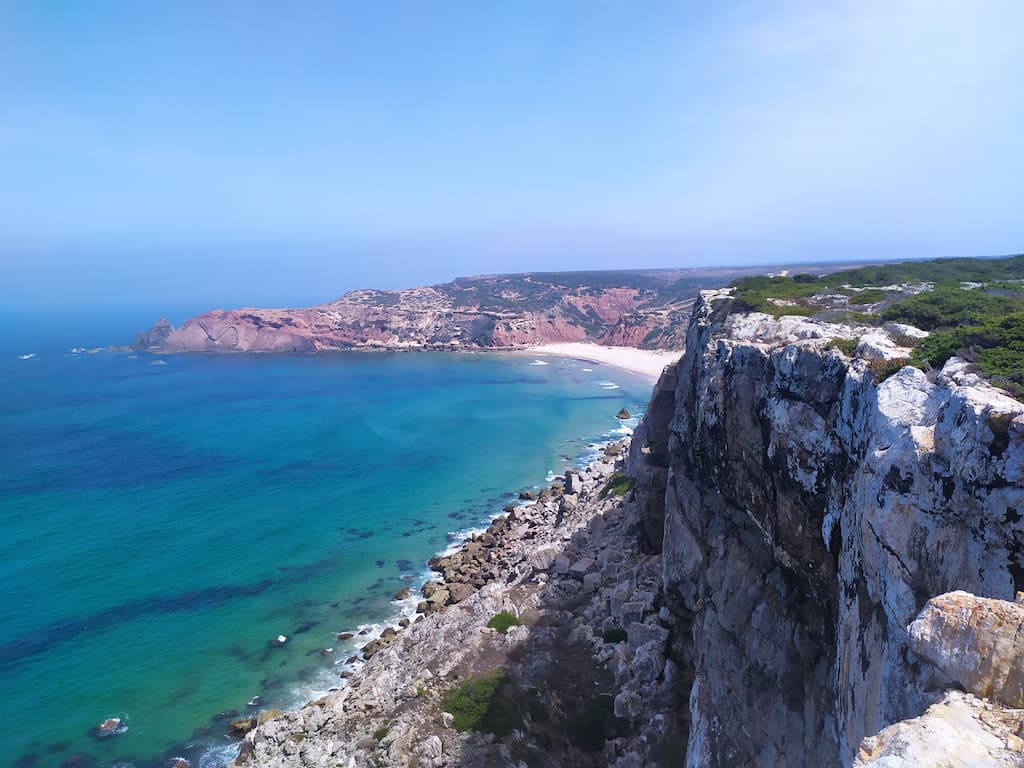 Soddisfatti della nostra giornata, ripercorriamo la strada fatta la mattina, torniamo verso Cabo de São Vicente, saliamo sul camper e ci dirigiamo verso Praia da Bordeira. Anche qui, uno spettacolo: dune di sabbia, spiaggia enorme, oceano e surfisti in acqua. Potrei risultare ripetitiva, ne sono consapevole, ma anche per questa tappa avevamo letto recensioni negative sui parcheggi e sulla possibilità di essere cacciati dalle forze dell’ordine, ma forse chi ha scritto i commenti negativi, ha dimenticato di specificare che magari aveva parcheggiato in modo poco consono alla situazione o forse un po’ pericoloso per lui e per la circolazione. Ribadisco, informarsi è giustissimo, ma va bene anche rischiare e vedere con i propri occhi. Abbiamo passato qui due notti in totale relax, ma sarebbe stato uno spreco non goderci un altro tratto di Rota Vicentina, quindi è di nuovo trekking. Lasciamo Bordeira e ci dirigiamo verso Azenha do Mar, punto di partenza del nostro percorso con destinazione Praia dos Machados. La camminata è stata più impegnativa rispetto alla precedente ma, caspita, che figata pazzesca! Trovarsi in mezzo a tutta quella meraviglia è disarmante, ci si sente così piccoli … siamo così piccoli …