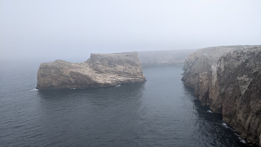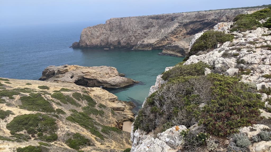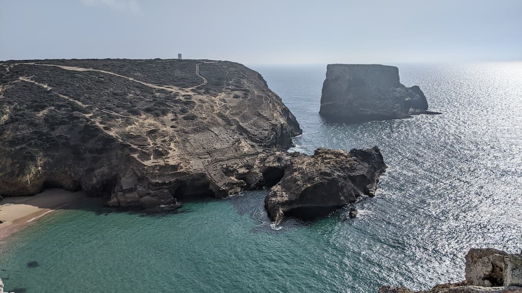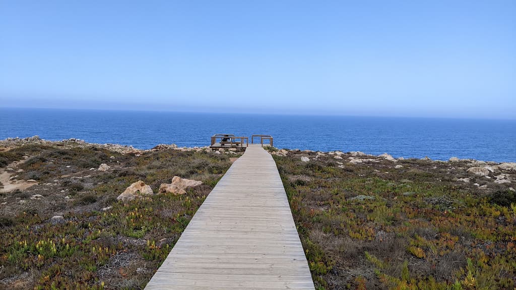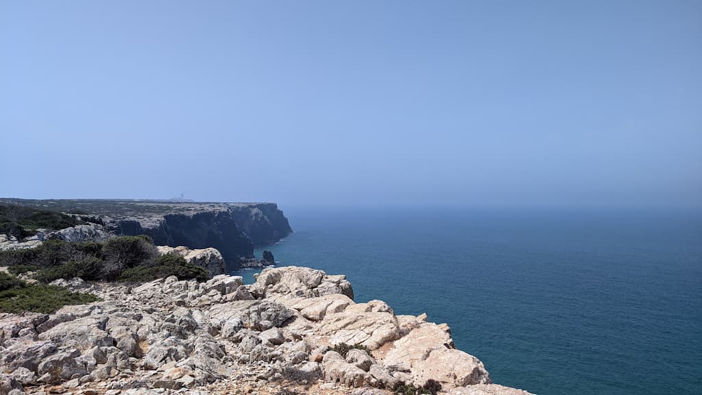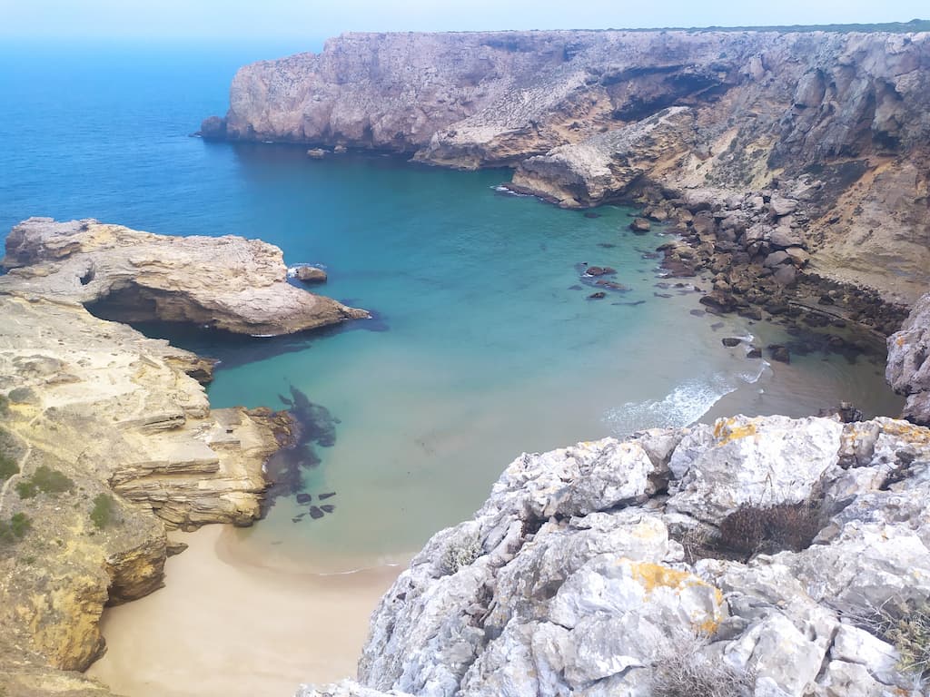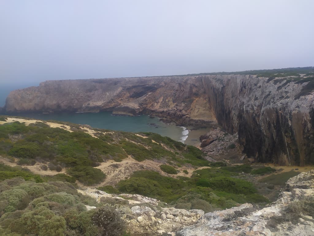 L’idea iniziale era quella di visitare Cabo de São Vicente e il faro, per godere, comodamente, del meraviglioso panorama da cartolina che offre la costa dell’Algarve, ma ormai ci siamo rassegnati al fatto che siamo bravissimi a cambiare i piani all’ultimo minuto e che, il “comodamente”, non sempre ci piace. Il giorno successivo, infatti, eravamo pronti per un bel trekking di circa 3 ore (andata e ritorno), trovato sull’app Komoot, che da Cabo de São Vicente arriva a Praia do Telheiro. Ci diciamo, visto che il percorso parte da lì, possiamo comunque andare a vedere il faro, ma come tradizione vuole, immancabili impalcature lo coprivano totalmente … Amen, la nostra meta era ormai un’altra.