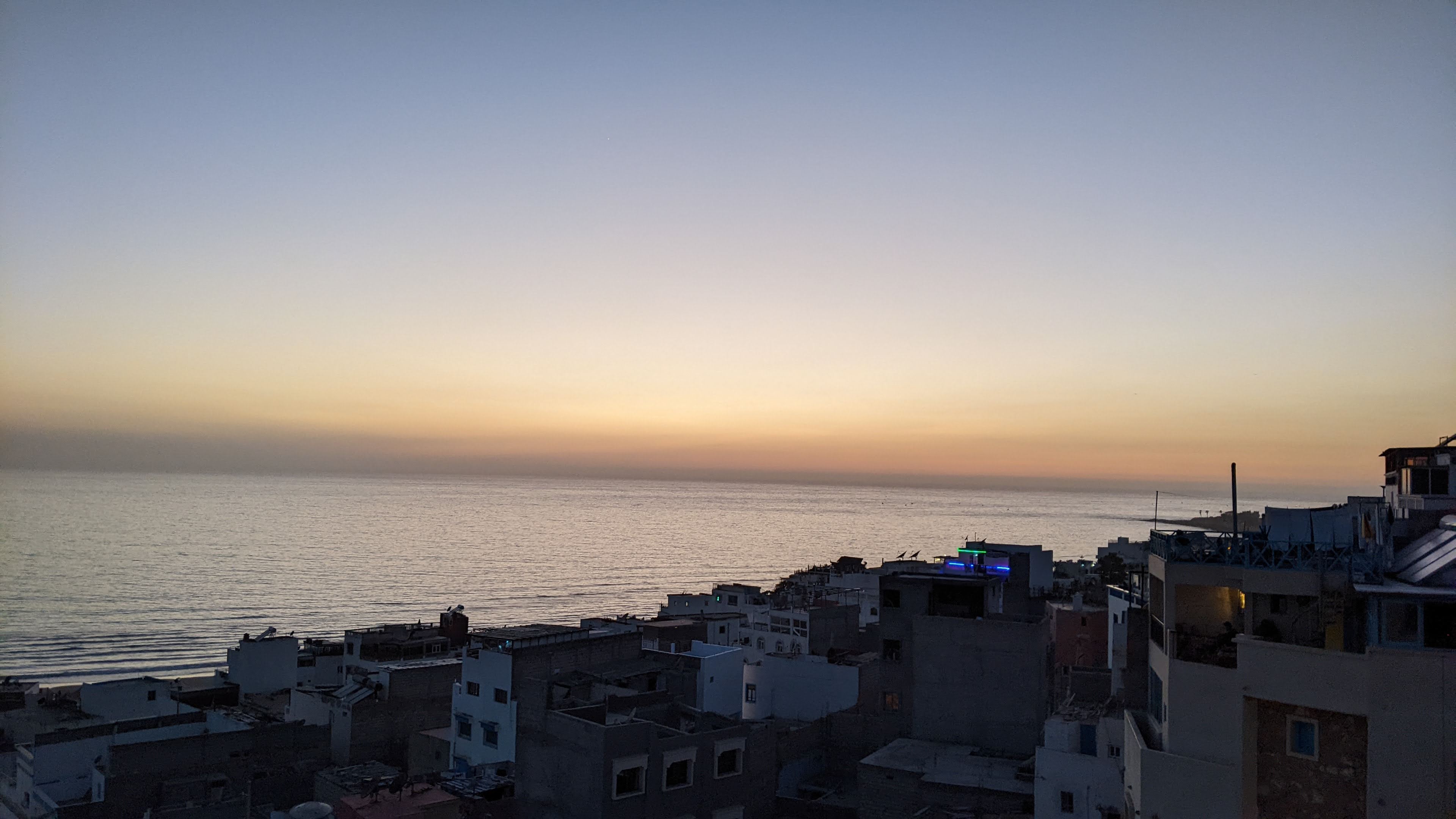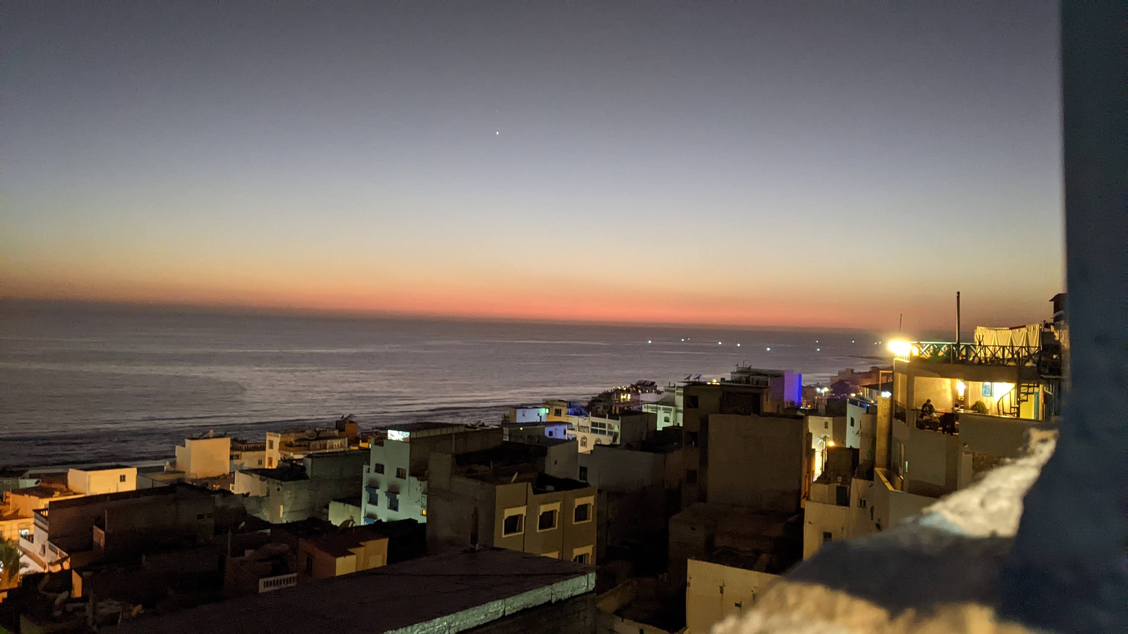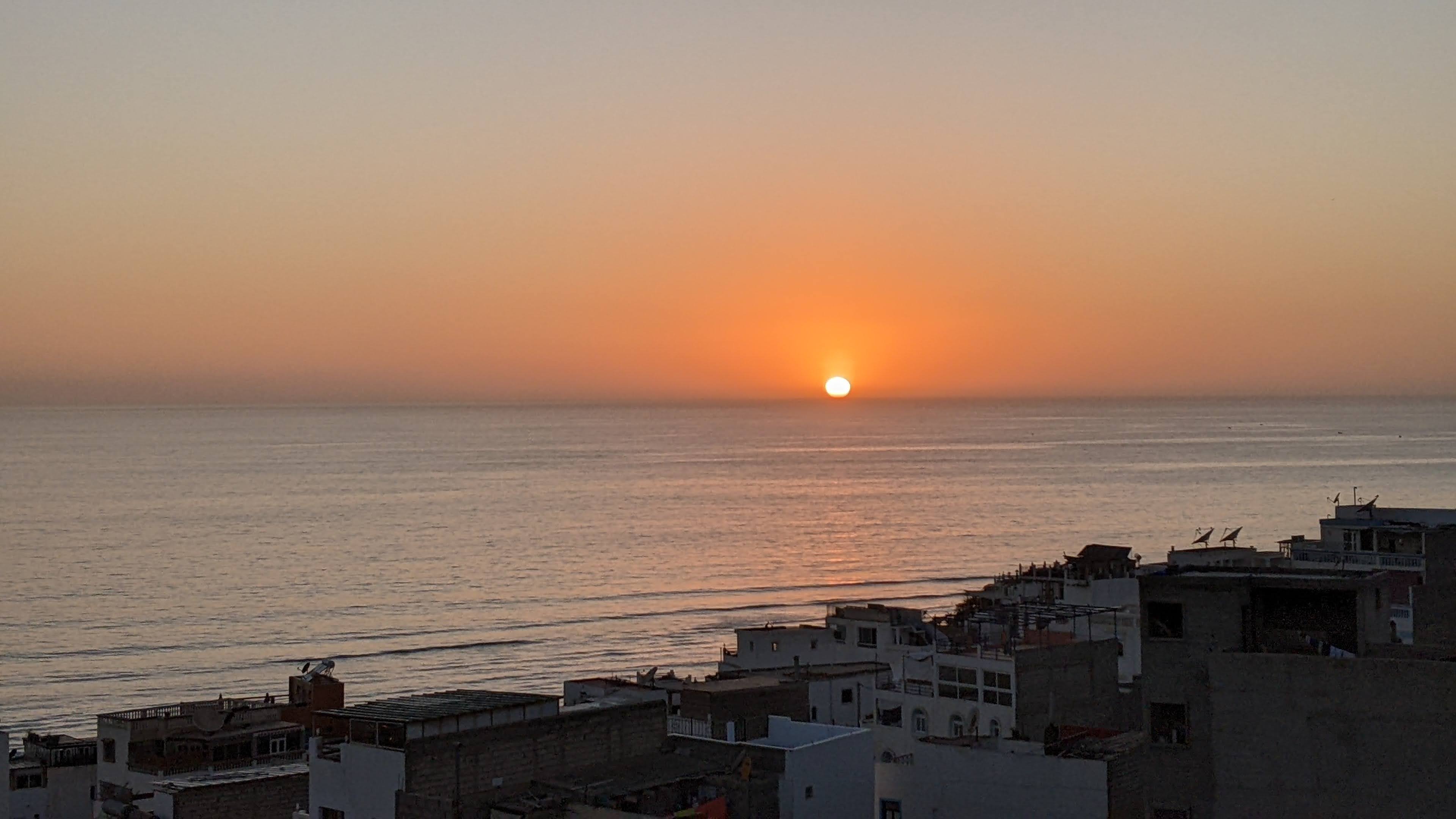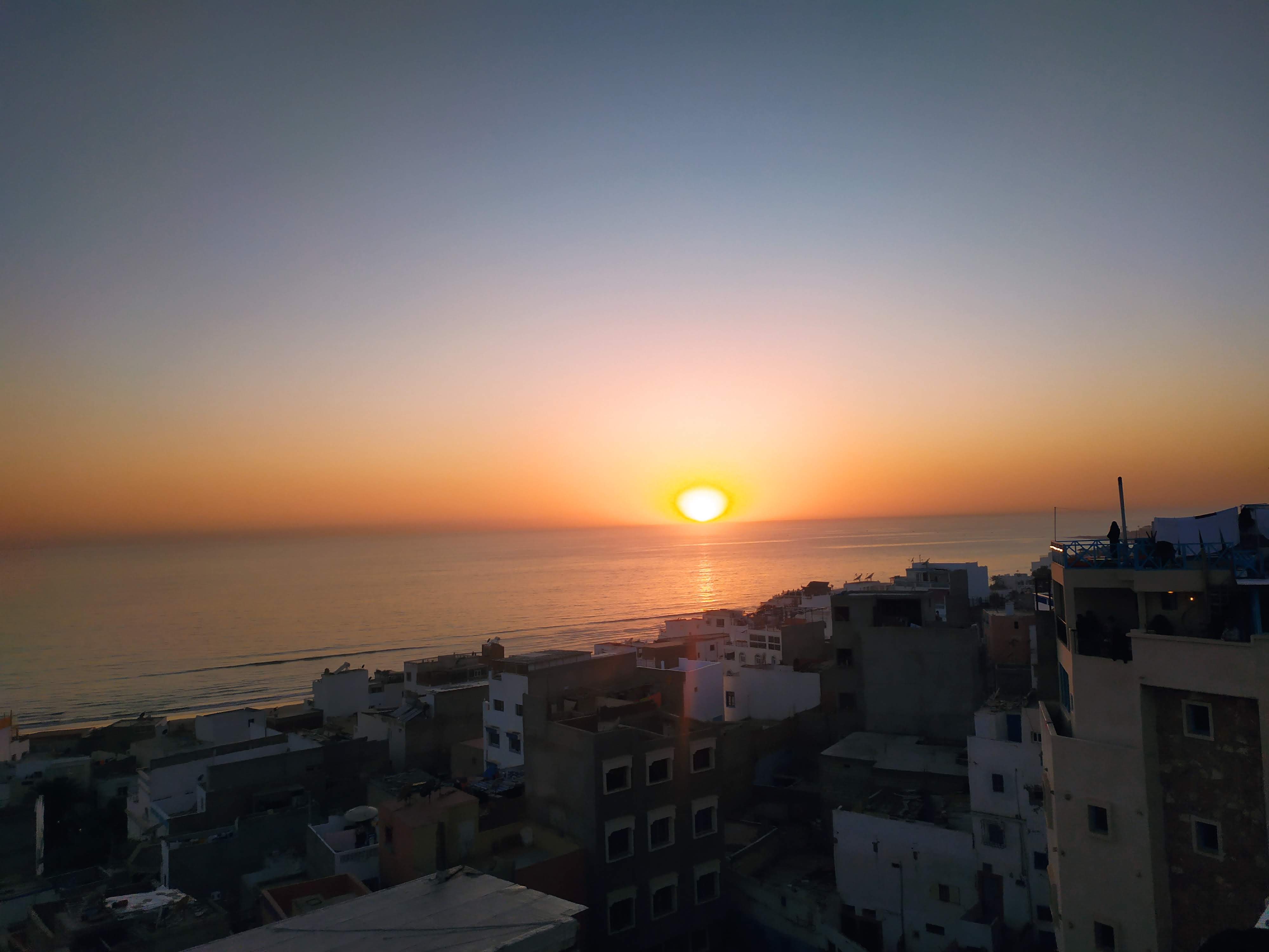 Sbrighiamo le classiche procedure aeroportuali rispolverando un po’ di francese ormai sepolto in qualche angolo del cervello, cambiamo dei soldi cercando di non farci fregare troppo con il cambio, usciamo dall’aeroporto, ci avviciniamo a un taxista e via con l’arte della contrattazione: purtroppo è una disciplina a me poco congeniale, ma Giuseppe e Simona sembravano praticarla discretamente. Detto ciò, ha vinto comunque lui perché i prezzi delle corse erano scritti in bella vista su di un cartellone. Ci dirigiamo verso Taghazout (a circa 50 minuti da Agadir). Siamo stati informati dell’esistenza di questo luogo tramite la nostra amica in viaggio con noi. Si tratta di un piccolo villaggio di pescatori sull’oceano non ancora troppo turistico.
