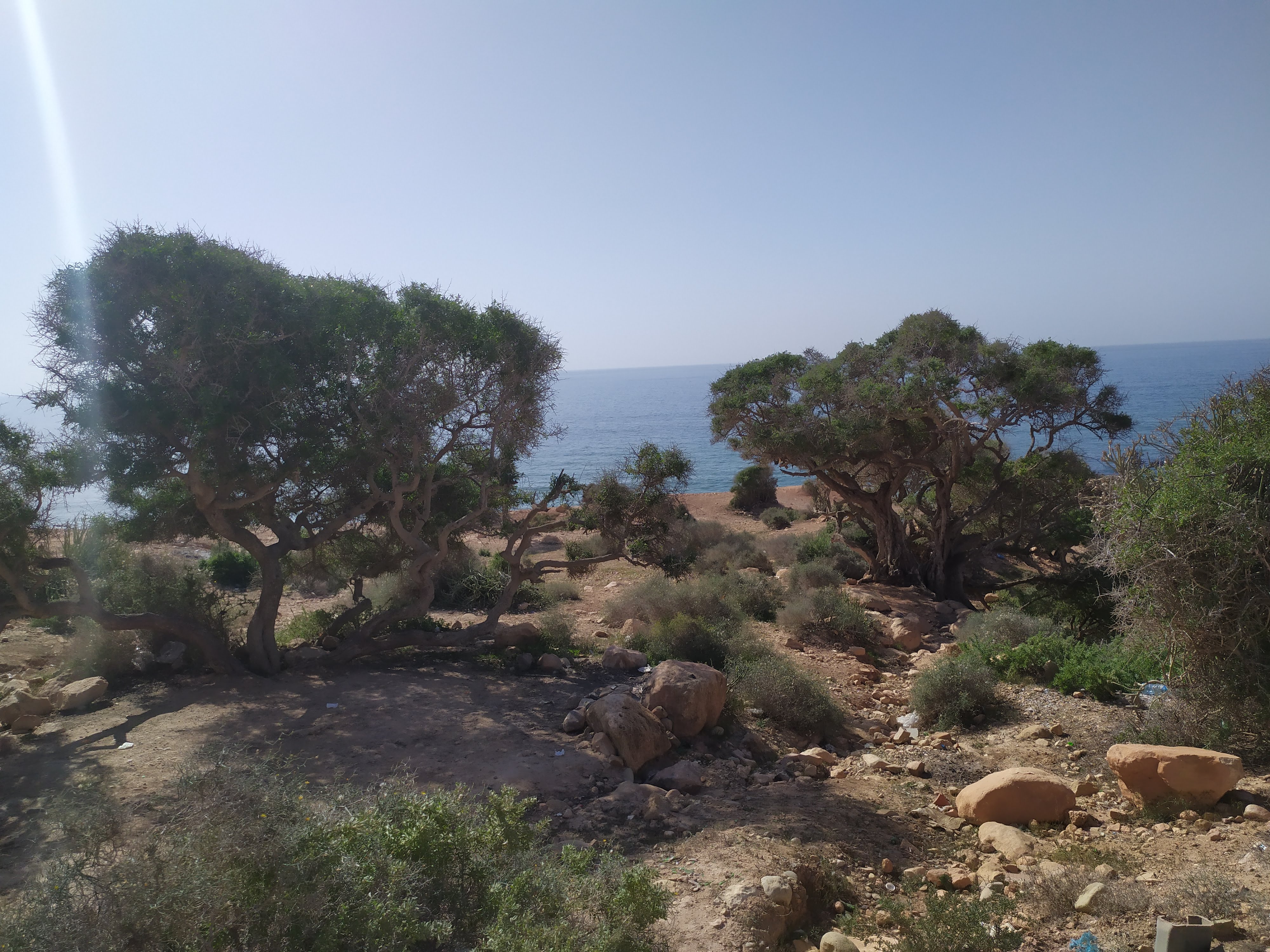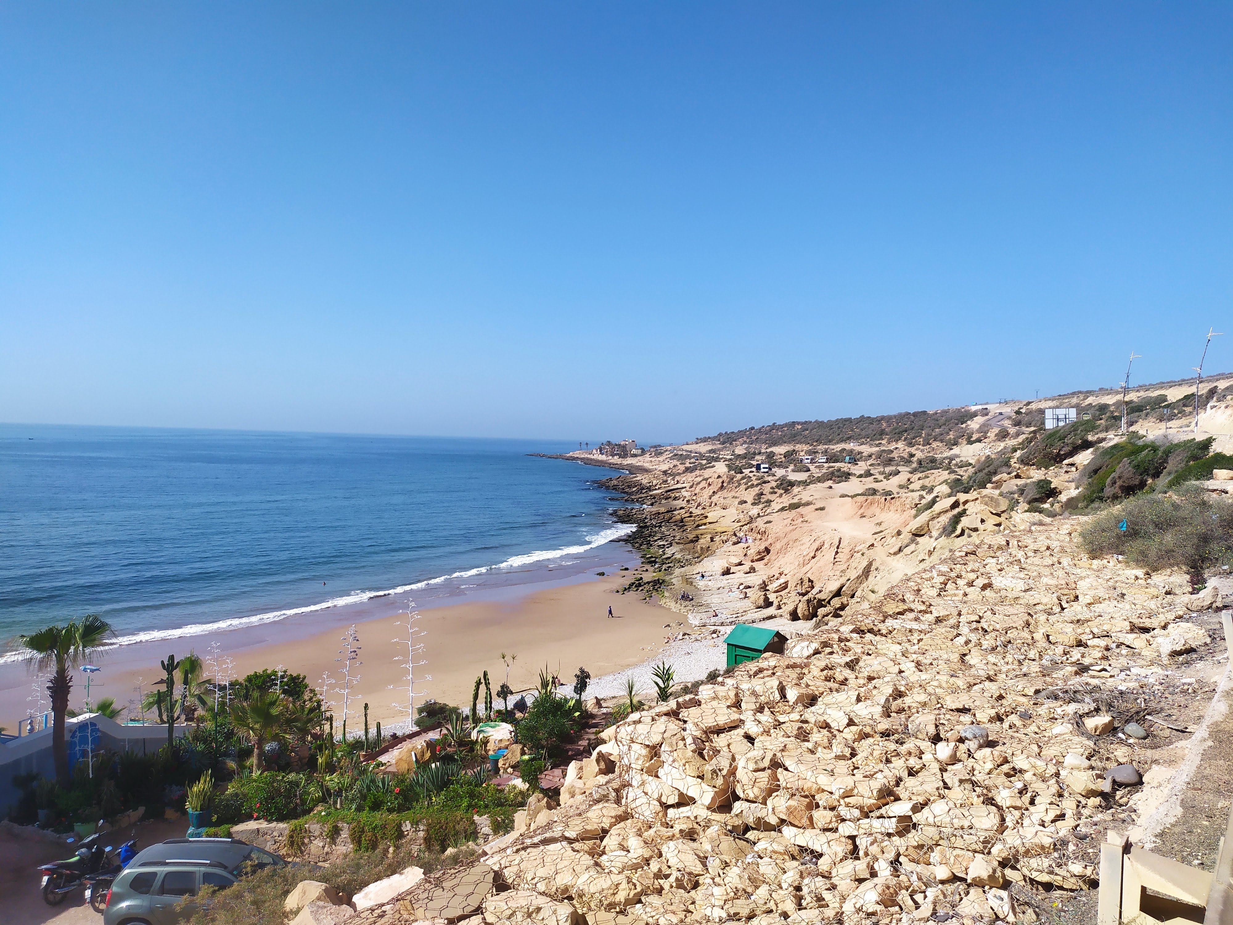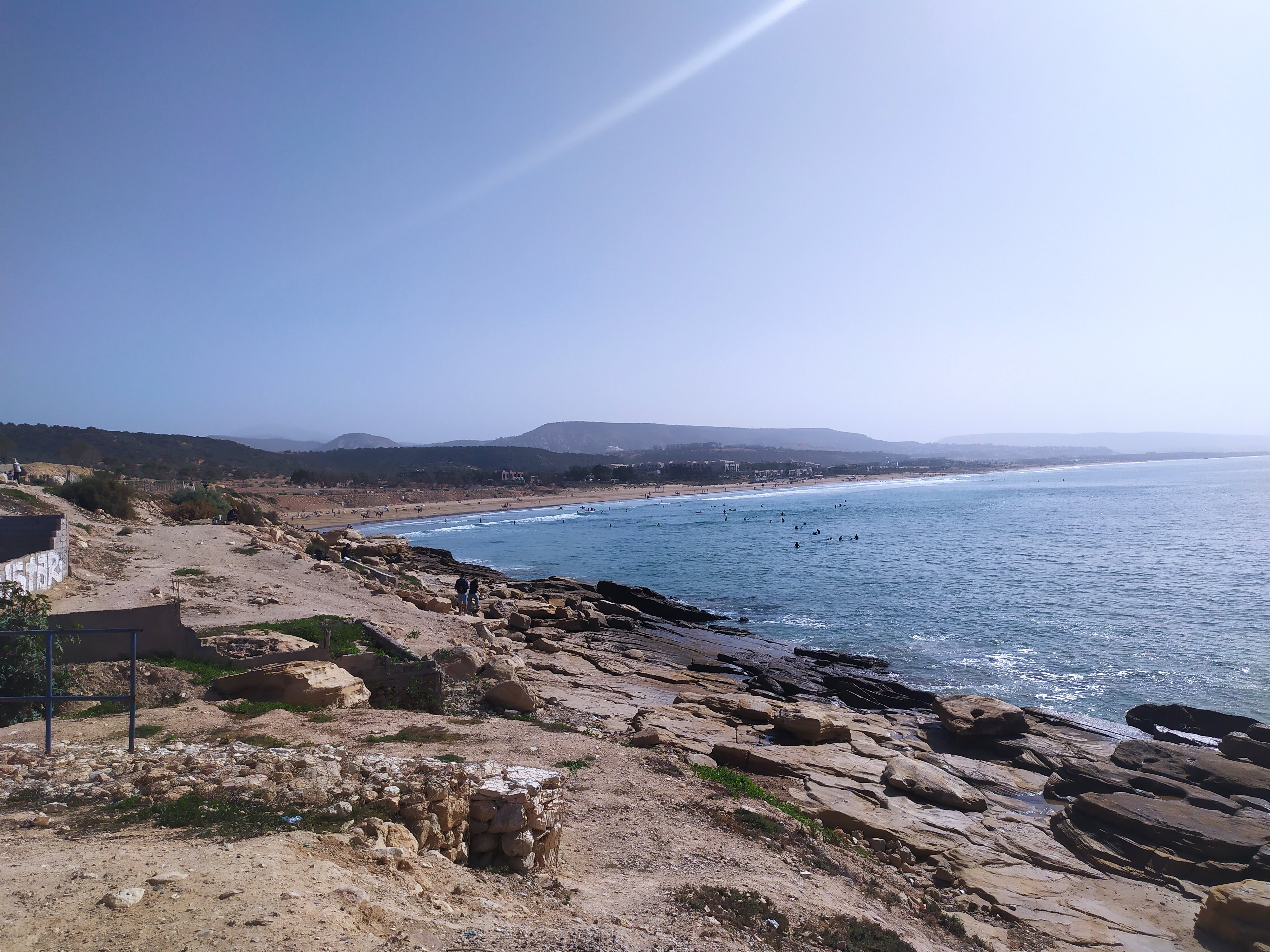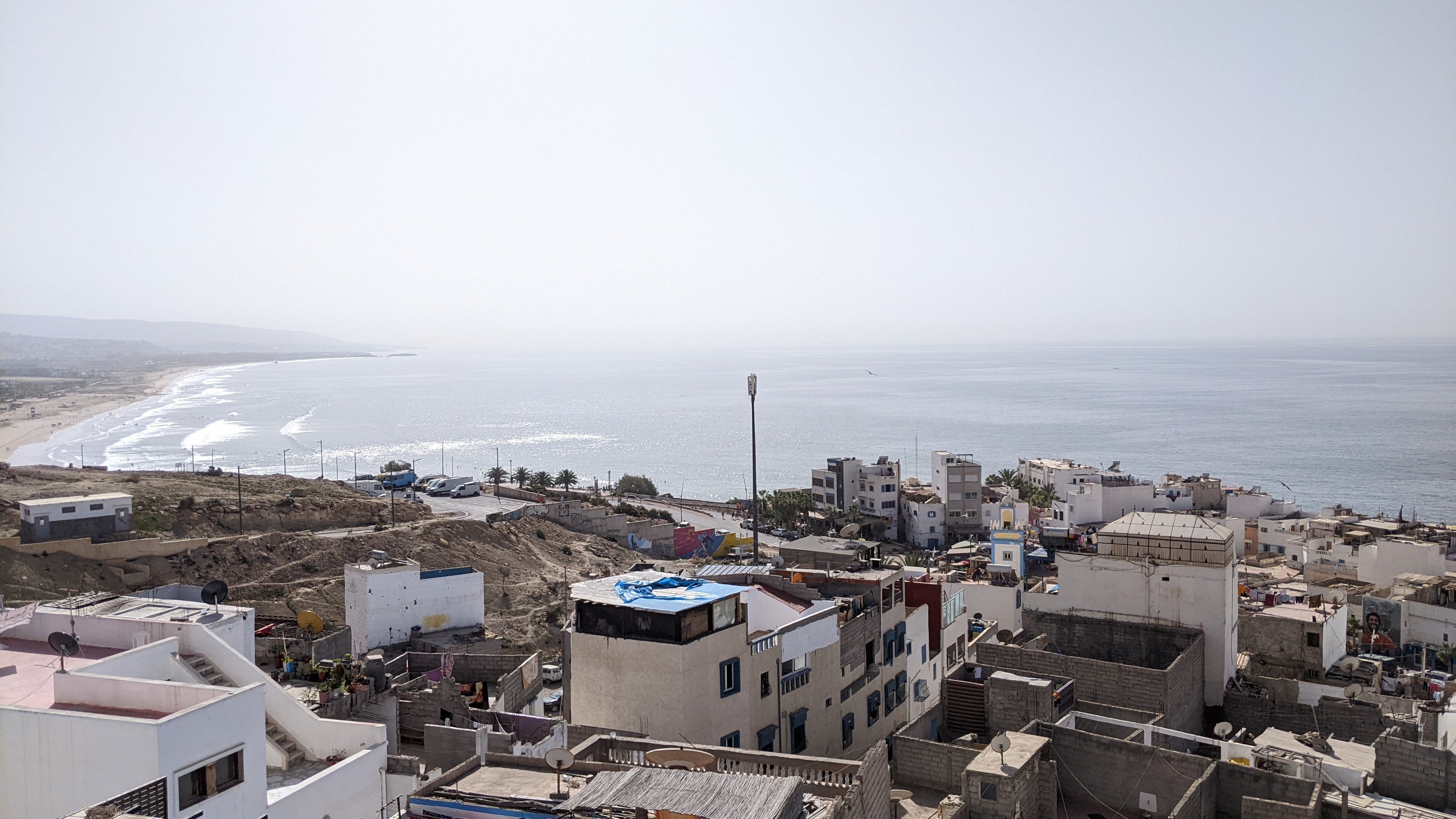 Sbrighiamo le classiche procedure aeroportuali rispolverando un po’ di francese ormai sepolto in qualche angolo del cervello, cambiamo dei soldi cercando di non farci fregare troppo con il cambio, usciamo dall’aeroporto, ci avviciniamo a un taxista e via con l’arte della contrattazione: purtroppo è una disciplina a me poco congeniale, ma Giuseppe e Simona sembravano praticarla discretamente. Detto ciò, ha vinto comunque lui perché i prezzi delle corse erano scritti in bella vista su di un cartellone. Ci dirigiamo verso Taghazout (a circa 50 minuti da Agadir). Siamo stati informati dell’esistenza di questo luogo tramite la nostra amica in viaggio con noi. Si tratta di un piccolo villaggio di pescatori sull’oceano non ancora troppo turistico.